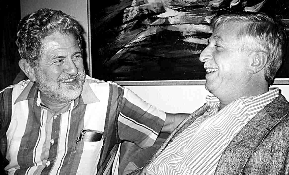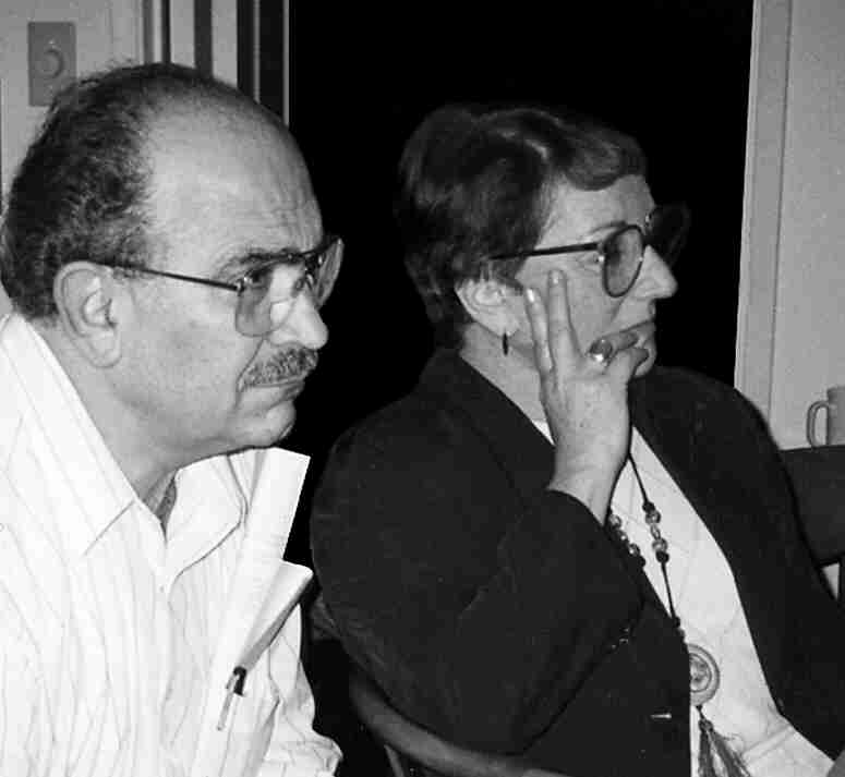 | Palestinian and Jew -- Elias Botto and Hilde Gattman -- sit side-by-side during serious discussion in the dialogue group. | Don Stone, a Jew, and Adham Salem, a Palestinian, share a lighter moment. |